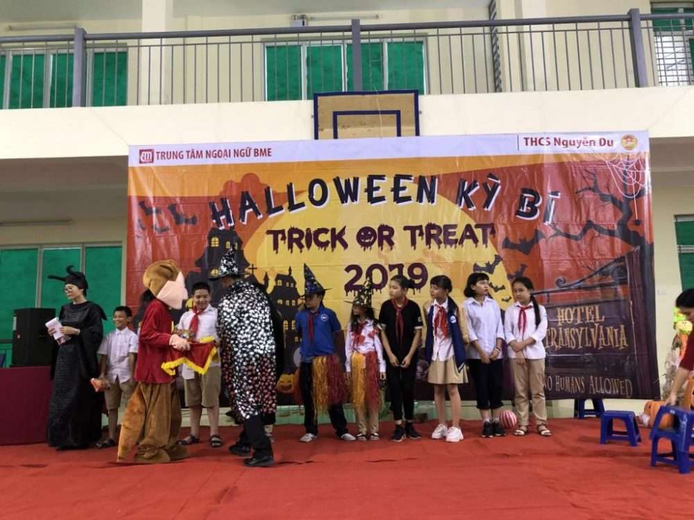 Ngày 28/10/2019, trường THCS Nguyễn Du đã diễn ra chương trình Halloween Kỳ Bí – Trick or treat. Đây là chương trình do Trung tâm Ngoại Ngữ Bình Minh (BME) phối hợp với nhà trường tổ chức nhằm tạo ra sân chơi giao lưu và tìm hiểu kiến thức cho các bạn học sinh.