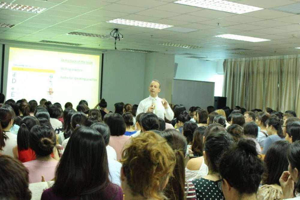 Công ty rất vinh dự khi được đón tiếp ông David Persey – Đại diện của nhà xuất bản National Geographic Learning là giảng viên chính trong buổi tập huấn ngày hôm nay. Với kinh nghiệm của mình, giảng viên Persey đã trình bày những đặc điểm của học sinh tiểu học và những phương pháp để tiếp cận học sinh thông qua nhiều phương tiện, dụng cụ học tập như: tranh ảnh, âm thanh, bài hát… Xen kẽ trong đó là những trò chơi, hoạt động nhóm để ôn tập và nhắc lại các phần đã được học trong bài giảng. Với phong cách trẻ trung, hài hước, giảng viên Persey đã tạo nên bầu không khí vui vẻ, sôi nổi cho buổi tập huấn.