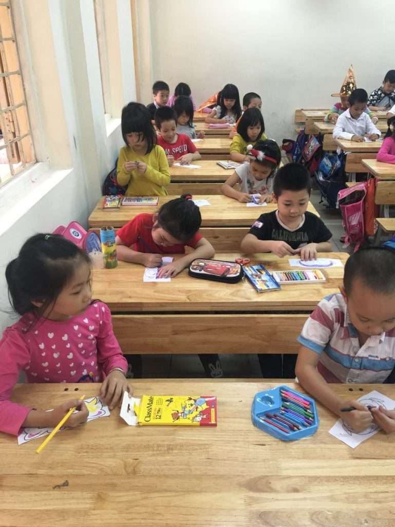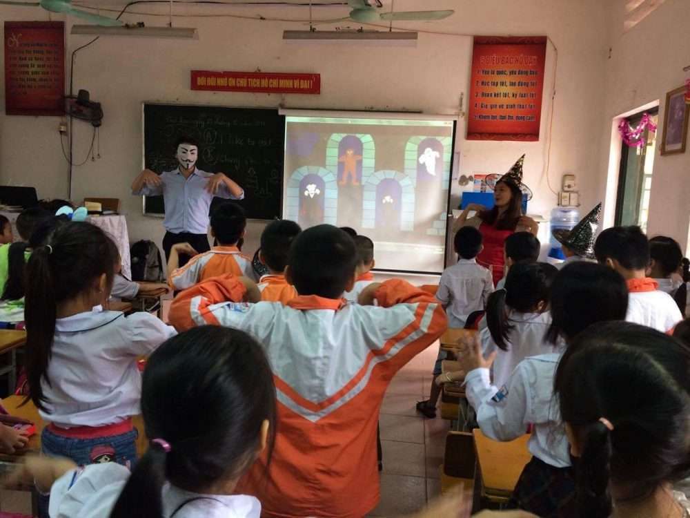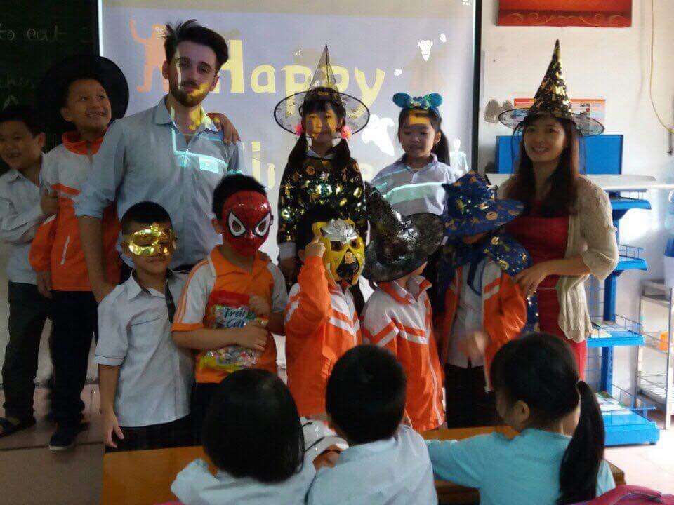 Các em học sinh đã rất bất ngờ và hào hứng khi các giáo viên nước ngoài cùng các bạn trợ giảng bước vào lớp trong những chiếc mặt nạ xinh xắn, và hóa trang thành các nhân vật trong phim hoạt hình, truyện tranh….
