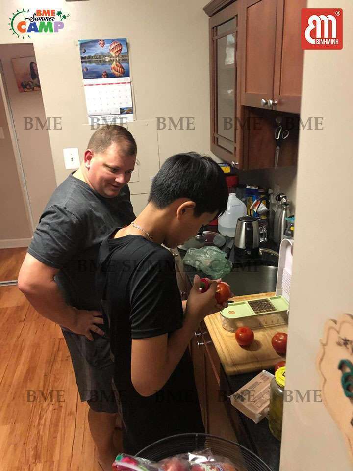 Chủ nhà thân thiện hướng dẫn bạn trại sinh làm đồ ăn.