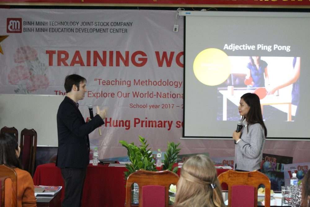 Bên cạnh đó, giảng viên Justin cũng đã hướng dẫn cho các giáo viên các bước để chuẩn bị giáo án thông qua các tài liệu của giáo trình Explore Our World. Với những bước đã được hướng dẫn, các giáo viên tham gia buổi tập huấn đã nắm được những cách thức để tự xây dựng cho mình một bài giảng đủ sức cuốn hút đối với học sinh lứa tuổi tiểu học.