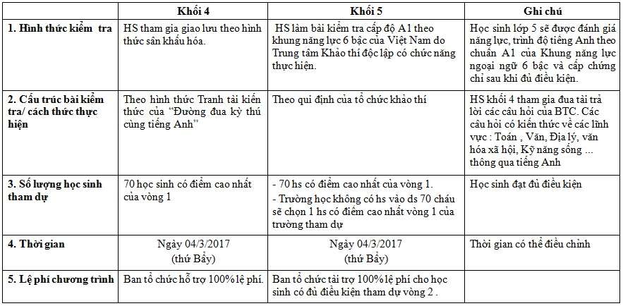 - Chương trình giao lưu “Em học giỏi tiếng Anh” là chương trình được tổ chức trên tinh thần tham gia tự nguyện của học sinh, không bắt buộc và không thu phí của học sinh. PHHS đăng ký cho học sinh tham gia theo mẫu của BTC, chịu trách nhiệm đưa học sinh đến điểm kiểm tra và đón học sinh đúng giờ, đúng địa điểm và bảo đảm an toàn cho học sinh.